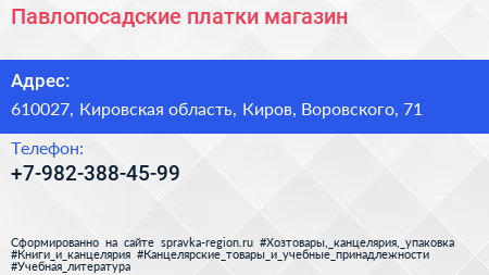 Павлопосадские платки, магазин по адресу 610027, Кировская область, Киров, Воровского, 71 в дальнейшем Организация, размещена в следующих категориях: