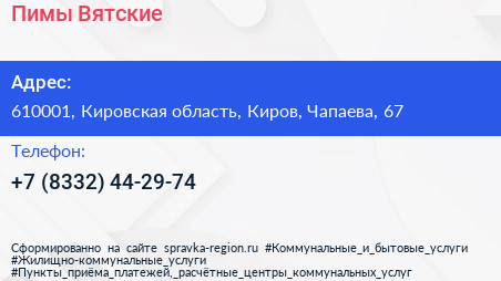 Пимы Вятские по адресу 610001, Кировская область, Киров, Чапаева, 67 в дальнейшем Организация, размещена в следующих категориях:
