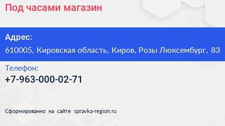 Под часами, магазин по адресу 610005, Кировская область, Киров, Розы Люксембург, 83 в дальнейшем Организация, размещена в следующих категориях: