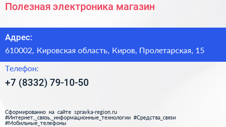 Полезная электроника, магазин по адресу 610002, Кировская область, Киров, Пролетарская, 15 в дальнейшем Организация, размещена в следующих категориях: