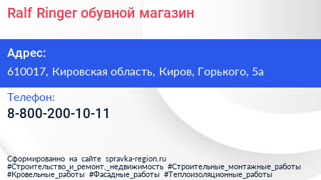 Ralf Ringer, обувной магазин по адресу 610017, Кировская область, Киров, Горького, 5а в дальнейшем Организация, размещена в следующих категориях: