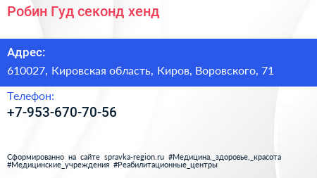 Робин Гуд, секонд-хенд по адресу 610027, Кировская область, Киров, Воровского, 71 в дальнейшем Организация, размещена в следующих категориях: