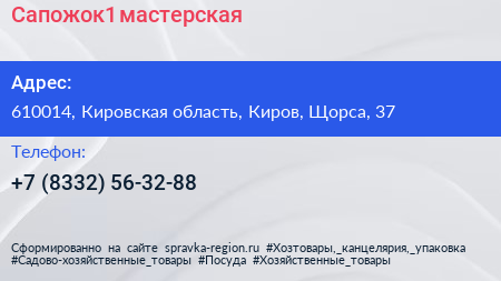 Сапожок1, мастерская по адресу 610014, Кировская область, Киров, Щорса, 37 в дальнейшем Организация, размещена в следующих категориях: