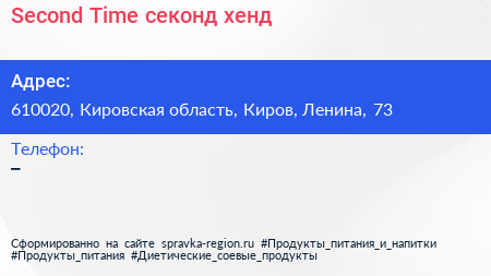 Second Time, секонд-хенд по адресу 610020, Кировская область, Киров, Ленина, 73 в дальнейшем Организация, размещена в следующих категориях: