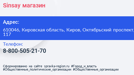 Sinsay, магазин по адресу 610046, Кировская область, Киров, Октябрьский проспект, 117 в дальнейшем Организация, размещена в следующих категориях: