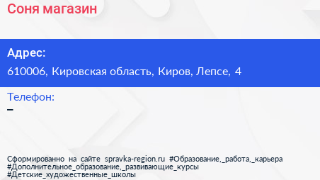 Соня, магазин по адресу 610006, Кировская область, Киров, Лепсе, 4 в дальнейшем Организация, размещена в следующих категориях: