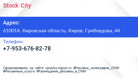 Stock City по адресу 610014, Кировская область, Киров, Грибоедова, 44 в дальнейшем Организация, размещена в следующих категориях:
