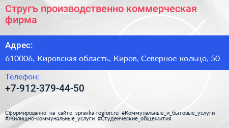 Стругъ, производственно-коммерческая фирма по адресу 610006, Кировская область, Киров, Северное кольцо, 50 в дальнейшем Организация, размещена в следующих категориях: