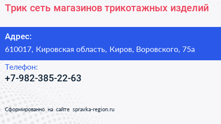 Трик, сеть магазинов трикотажных изделий по адресу 610017, Кировская область, Киров, Воровского, 75а в дальнейшем Организация, размещена в следующих категориях: