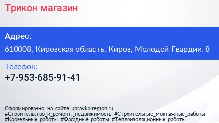 Трикон, магазин по адресу 610008, Кировская область, Киров, Молодой Гвардии, 8 в дальнейшем Организация, размещена в следующих категориях: