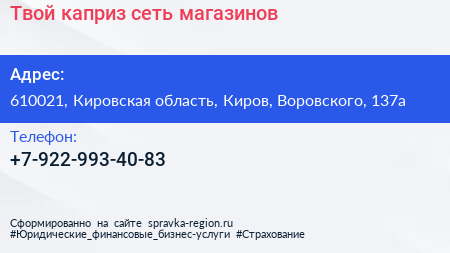 Твой каприз, сеть магазинов по адресу 610021, Кировская область, Киров, Воровского, 137а в дальнейшем Организация, размещена в следующих категориях: