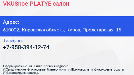VKUSnoe PLATYE, салон по адресу 610002, Кировская область, Киров, Пролетарская, 15 в дальнейшем Организация, размещена в следующих категориях: