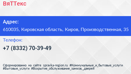 ВяТТекс по адресу 610035, Кировская область, Киров, Производственная, 35 в дальнейшем Организация, размещена в следующих категориях: