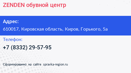 ZENDEN, обувной центр по адресу 610017, Кировская область, Киров, Горького, 5а в дальнейшем Организация, размещена в следующих категориях: