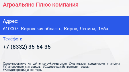 Агроальянс-Плюс, компания по адресу 610007, Кировская область, Киров, Ленина, 166а в дальнейшем Организация, размещена в следующих категориях: