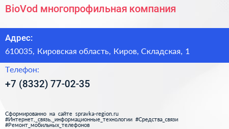 BioVod, многопрофильная компания по адресу 610035, Кировская область, Киров, Складская, 1 в дальнейшем Организация, размещена в следующих категориях: