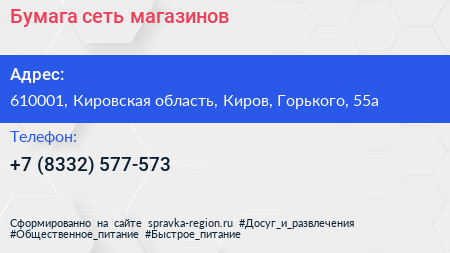 Бумага, сеть магазинов по адресу 610001, Кировская область, Киров, Горького, 55а в дальнейшем Организация, размещена в следующих категориях: