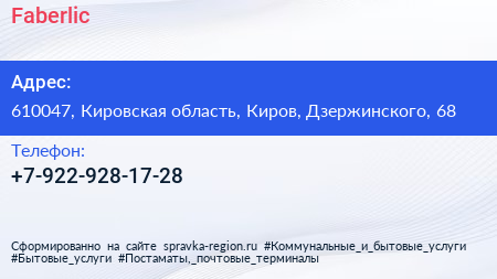 Faberlic по адресу 610047, Кировская область, Киров, Дзержинского, 68 в дальнейшем Организация, размещена в следующих категориях:
