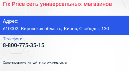 Fix Price, сеть универсальных магазинов по адресу 610002, Кировская область, Киров, Свободы, 130 в дальнейшем Организация, размещена в следующих категориях: