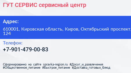 ГУТ СЕРВИС, сервисный центр по адресу 610001, Кировская область, Киров, Октябрьский проспект, 124 в дальнейшем Организация, размещена в следующих категориях: