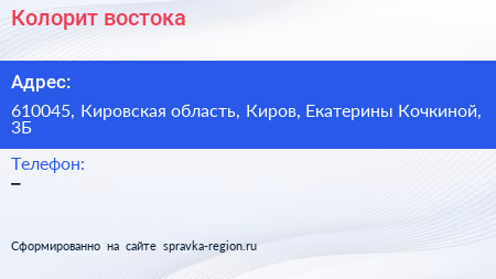 Колорит востока по адресу 610045, Кировская область, Киров, Екатерины Кочкиной, 3Б в дальнейшем Организация, размещена в следующих категориях: