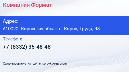 Компания Формат по адресу 610020, Кировская область, Киров, Труда, 48 в дальнейшем Организация, размещена в следующих категориях: