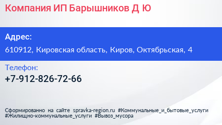 Компания, ИП Барышников Д.Ю. по адресу 610912, Кировская область, Киров, Октябрьская, 4 в дальнейшем Организация, размещена в следующих категориях: