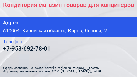 Кондитория, магазин товаров для кондитеров по адресу 610004, Кировская область, Киров, Ленина, 2 в дальнейшем Организация, размещена в следующих категориях: