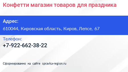 Конфетти, магазин товаров для праздника по адресу 610044, Кировская область, Киров, Лепсе, 67 в дальнейшем Организация, размещена в следующих категориях: