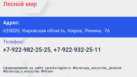 Лесной мир по адресу 610020, Кировская область, Киров, Ленина, 76 в дальнейшем Организация, размещена в следующих категориях: