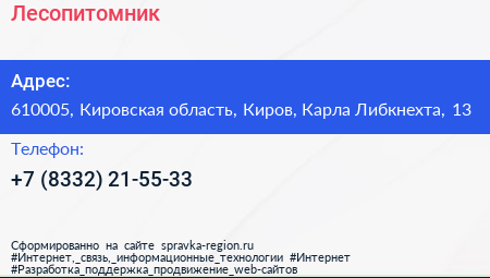 Лесопитомник по адресу 610005, Кировская область, Киров, Карла Либкнехта, 13 в дальнейшем Организация, размещена в следующих категориях: