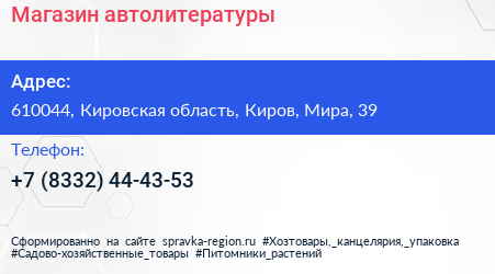 Магазин автолитературы по адресу 610044, Кировская область, Киров, Мира, 39 в дальнейшем Организация, размещена в следующих категориях: