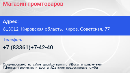Магазин промтоваров по адресу 613012, Кировская область, Киров, Советская, 77 в дальнейшем Организация, размещена в следующих категориях: