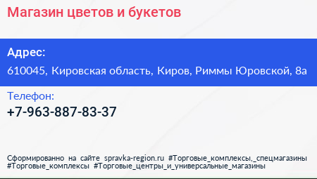 Магазин цветов и букетов по адресу 610045, Кировская область, Киров, Риммы Юровской, 8а в дальнейшем Организация, размещена в следующих категориях: