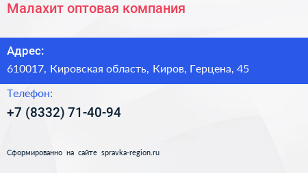 Малахит, оптовая компания по адресу 610017, Кировская область, Киров, Герцена, 45 в дальнейшем Организация, размещена в следующих категориях:
