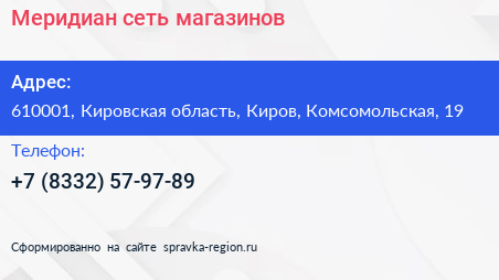 Меридиан, сеть магазинов по адресу 610001, Кировская область, Киров, Комсомольская, 19 в дальнейшем Организация, размещена в следующих категориях: