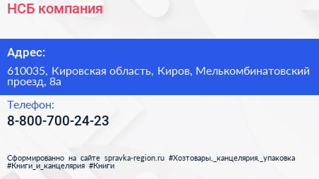 НСБ, компания по адресу 610035, Кировская область, Киров, Мелькомбинатовский проезд, 8а в дальнейшем Организация, размещена в следующих категориях: