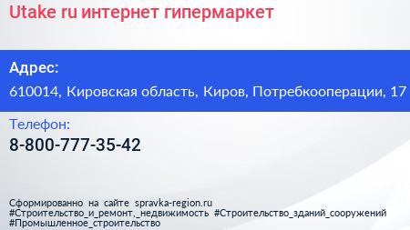 Utake.ru, интернет-гипермаркет по адресу 610014, Кировская область, Киров, Потребкооперации, 17 в дальнейшем Организация, размещена в следующих категориях: