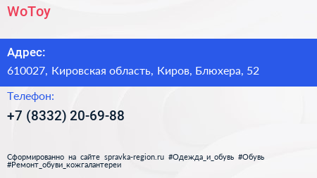 WoToy по адресу 610027, Кировская область, Киров, Блюхера, 52 в дальнейшем Организация, размещена в следующих категориях: