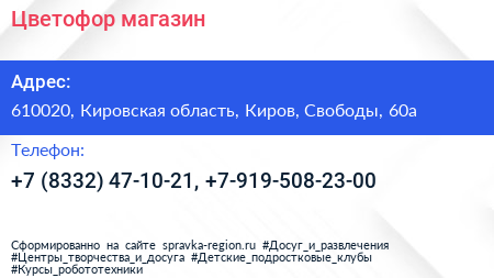 Цветофор, магазин по адресу 610020, Кировская область, Киров, Свободы, 60а в дальнейшем Организация, размещена в следующих категориях: