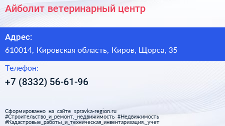 Айболит, ветеринарный центр по адресу 610014, Кировская область, Киров, Щорса, 35 в дальнейшем Организация, размещена в следующих категориях: