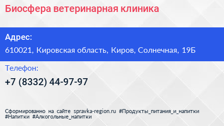 Биосфера, ветеринарная клиника по адресу 610021, Кировская область, Киров, Солнечная, 19Б в дальнейшем Организация, размещена в следующих категориях: