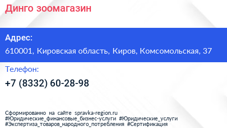 Динго, зоомагазин по адресу 610001, Кировская область, Киров, Комсомольская, 37 в дальнейшем Организация, размещена в следующих категориях: