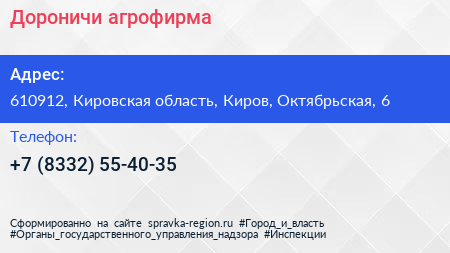 Дороничи, агрофирма по адресу 610912, Кировская область, Киров, Октябрьская, 6 в дальнейшем Организация, размещена в следующих категориях: