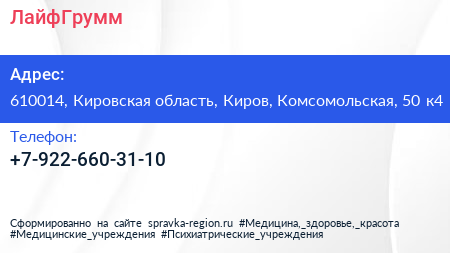 ЛайфГрумм по адресу 610014, Кировская область, Киров, Комсомольская, 50 к4 в дальнейшем Организация, размещена в следующих категориях: