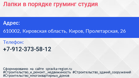 Лапки в порядке, груминг-студия по адресу 610002, Кировская область, Киров, Пролетарская, 26 в дальнейшем Организация, размещена в следующих категориях: