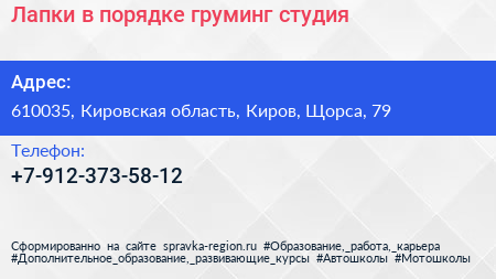 Лапки в порядке, груминг-студия по адресу 610035, Кировская область, Киров, Щорса, 79 в дальнейшем Организация, размещена в следующих категориях: