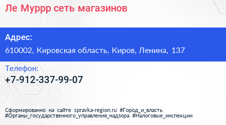 Ле`Муррр, сеть магазинов по адресу 610002, Кировская область, Киров, Ленина, 137 в дальнейшем Организация, размещена в следующих категориях: