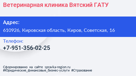 Ветеринарная клиника, Вятский ГАТУ по адресу 610926, Кировская область, Киров, Советская, 16 в дальнейшем Организация, размещена в следующих категориях: