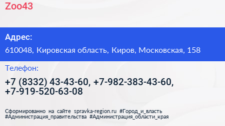 Zoo43 по адресу 610048, Кировская область, Киров, Московская, 158 в дальнейшем Организация, размещена в следующих категориях: